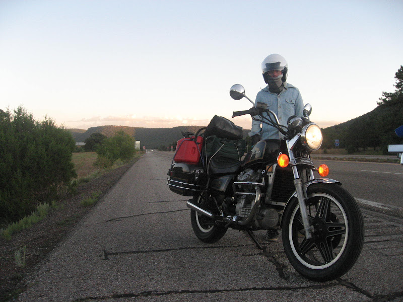 Crossing the border into New Mexico Jordan pumps his fist triumphantly in front of me. The grassland crosses the border but the plains heave up scattered rocky plateaus now. It's dark at this point and cold for the first time. This is the first time we've ridden without at least city lights to guide us and I see a great beast lumbering along the side of 412. My heart races and I get goose bumps. Gord and I stop at a gas station and I ask "Did you by any chance notice that huge unidentifieable creature coming in?" which he did. After some deliberation he setteles on a baby buffalo (seriously) and I am split between bear and a man sized wolf.